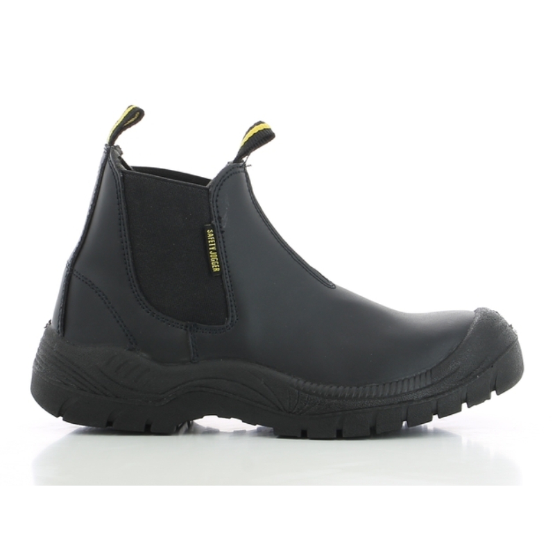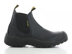 Leather shoe with elastic, black, Cambrella lining, antistatic, puncture resistant steel sole, shock proof, antislip, steel toe cap, S1P PU sole.