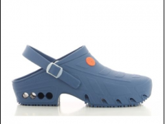 The model OXYCLOG is a clog for the operation room with an adjustable strap to guarantee a perfect fit. The anatomic shaped foot bed gives optimal support. This shoe easily meets every requirement of the OR. This clog can be chemically or UV sterilized and is autoclavable. The shoe is also wachine washable at 90°C or 194°F. The slip resistant outsole provides a good grip both on wet and dry surfaces. The closed top is to protect the foot, but lateral vents take care of the needed ventillation.